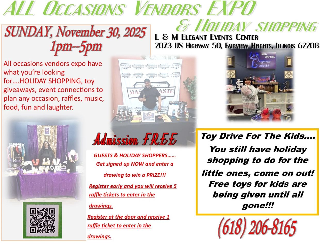 Guests we welcome you to this holiday experience of shopping and vendor connections. Fun, shopping, music, food, giveaways, raffles and connections.....DON'T MISS OUT!!! Register early and get 5 entry tickets.....You could be a winner! If you register at the door, you only get 1 entry ticket. This event is FREE for ALL Guests!